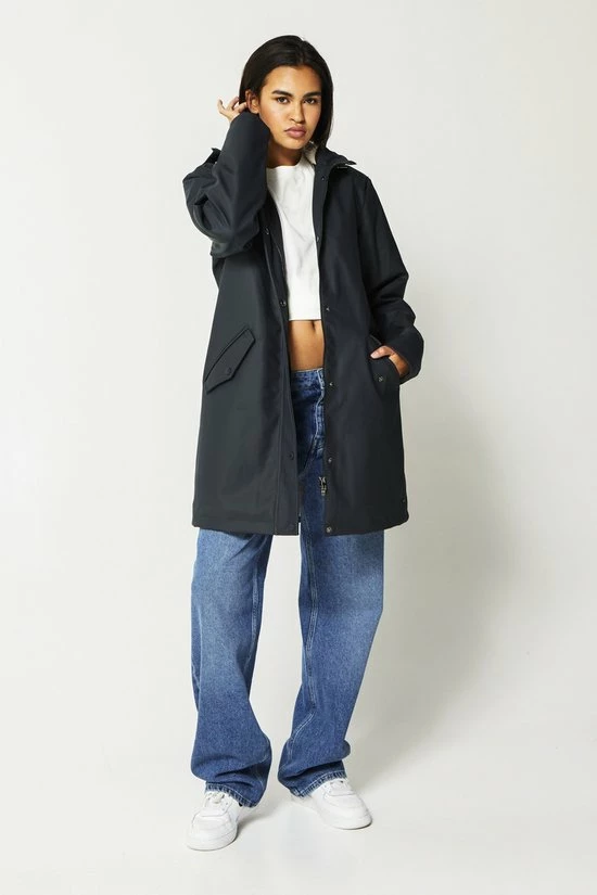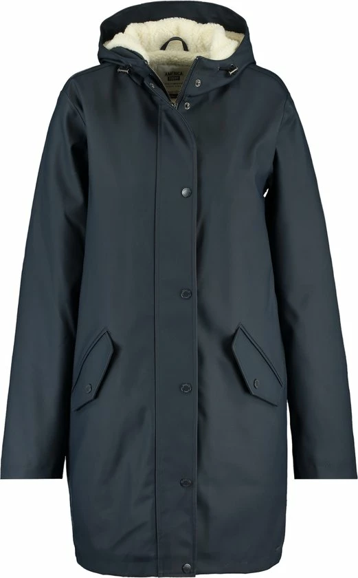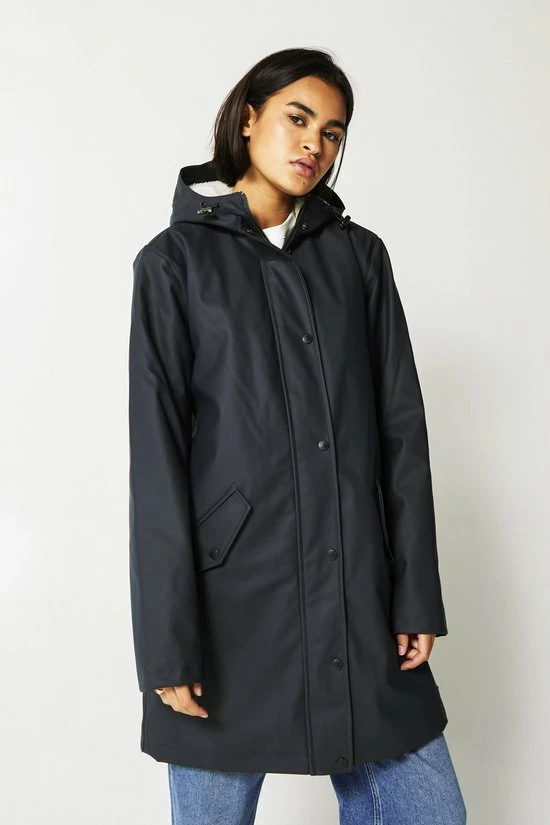America Today dames regenjas. De Janice teddy is een lange regenjas met capuchon ideaal voor op de fiets. De capuchon kan doormiddel van een trekkoord aangetrokken worden voor extra bescherming. Daarnaast is de regenjas voorzien van een rits- en drukknoopsluiting en twee steekzakken met drukknoopsluiting. De teddy binnenstof houd je lekker warm tijdens de koude regen dagen.