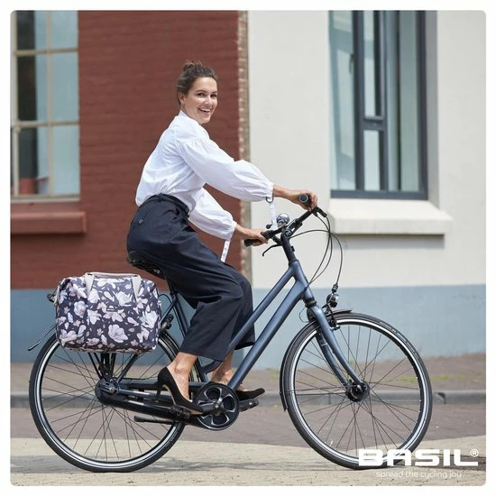 De Basil Magnolia Carry All Bag is een enkele fietshandtas in donkerblauw. Hij is voorzien van een leuke bloemenprint en is daarom vooral geschikt voor een damesfiets. Ga je altijd met de fiets naar je werk of naar school, en kan je wel een praktische tas gebruiken om je spullen te vervoeren? Dan komt deze handige fietshandtas wellicht goed van pas. Je maakt hem eenvoudig vast aan je bagagedrager dankzij het Hook On-systeem. En je neemt hem er ook gemakkelijk weer af. De tas is gemaakt van waterafstotend materiaal. Bovendien krijg je een regenhoes meegeleverd bij je aankoop, waardoor ook de tas met inhoud droog blijft. Verder is de tas voorzien van een stevige binnenvoering en een handige ritssluiting. En dankzij de hengsels draag je de tas in je handen of gewoon over je schouder. Wel zo praktisch. Dankzij een inhoud van 18 liter kan je flink wat spulletjes vervoeren. Deze fietstas maakt jouw fietsrit niet alleen leuker, maar ook een stuk gemakkelijker. Zoek je naast een nieuwe fietstas ook bijbehorende fietsaccessoires? Je treft ze elders aan op de website. Eigenschappen: De Basil Magnolia Carry All Bag is een fietsschoudertas met een totale inhoud van 18 liter. Dankzij de meegeleverde regenhoes is de tas gemakkelijk waterdicht af te sluiten. De fietstas monteer je eenvoudig aan de bagagedrager van je fiets of je maakt gebruik van de handige schouderriem. De reflectiedetails zorgen ervoor dat je ook in het donker goed zichtbaar bent. Perfect voor een E-bike.