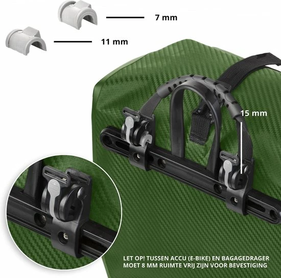 Het maakt niet uit of je een reguliere fiets, elektrische fiets of sportfiets hebt. Zolang je fiets een bagagedrager heeft met een buisdiameter van 0.7 tot 1,5 cm kun je de tas bevestigen. Op 95% van alle fietsen met een bagagedrager met een buisdiameter van 0.7 tot 1.5 cm kun je de tas bevestigen. Bagagedragers worden door verschillende merken in verschillende buisdiktes geproduceerd en daarom leveren wij bij de tas 2 extra stelringen, zodat de tas passend gemaakt kan worden. Voor het monteren van de tas op een electrische fiets met accu is een minimale ruimte van 1.5 cm nodig. Alleen al in Nederland staan er 21 verschillende fietsmerken geregistreerd maar dit zijn er met de nog niet geregistreerde merken en buitenlandse merken nog veel meer. Vermenigvuldig dit met het aantal modellen en dan hebben we het over honderden fietsmodellen. Omdat ook fietsmodellen regelmatig wisselen is het voor ons onmogelijk om deze ontwikkelingen te volgen en U een garantie te geven dat de tas ook op uw fiets past maar uit onze ervaring weten we dat dit voor 95% van alle fietsen met bagagedrager gaat passen.