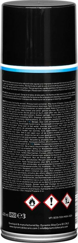 Voor de beste remprestaties moeten je remschijven en velgremmen vrij zijn van olie, vet en ander vuil. Brake Booster is een effectieve remreiniger voor het reinigen van disc brakes, velgranden en remblokken. De krachtige reiniger verwijderd zelfs het meest hardnekkige vuil zonder je remmen aan te tasten. De formule is veilig om te gebruiken op alle remonderdelen en op materialen zoals rubber, plastic, metaal en carbon. Met de spuitbus kan de remreiniger gelijkmatig worden aangebracht. Brake Booster droogt snel en laat geen residue achter.