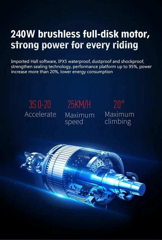- Lichtgewicht en opvouwbaar: de behuizing van onze elektrische fiets is gemaakt van hoogwaardig metaal, dat licht in gewicht en sterk is in stabiliteit, zorgvuldig gebouwd met 58 procedures, met een gewicht van 120 kg. het kan ook met ??n hand worden opgetild. De breedte is slechts 200mm na gevouwen, gemakkelijk in de kofferbak te plaatsen.
