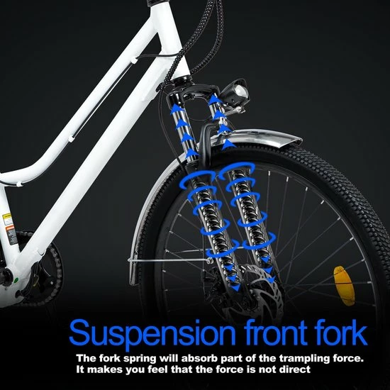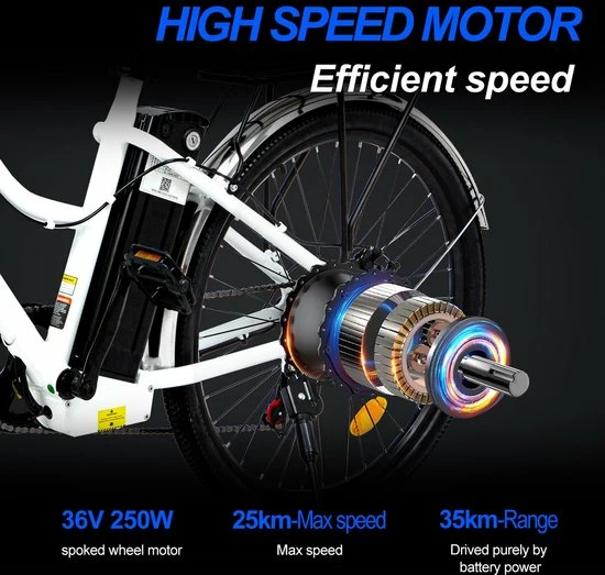 Motor: achterwielmotor, zeer stil, dubbele trapassensoren, praktische voortstuwingsondersteuning, 3 ondersteuningsniveaus van lichte ondersteuning tot maximale voortstuwing op steile hellingen, ondersteunt snelheden tot 25 km/u
