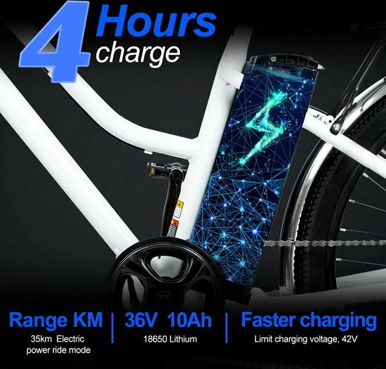 Batterij: 36 V, 11,2 Ah, volledig geïntegreerde batterij met de nieuwste Li-Ion-technologie en duurzame hoogwaardige batterij van het merk, 250 W, geoptimaliseerd batterijbeheersysteem, gecoördineerde procedures voor het balanceren van de batterij.