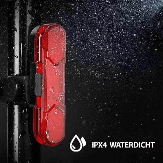 Dit achterlicht voor jouw fiets heeft een helderheid van 20 lumen, hiermee ben je goed zichtbaar voor je medeweggebruikers! De fietslamp is voorzien van 5 lichtstanden [ Helder / Flash / Interval / Rhythm / Alarm ], waarmee je het achterlicht in kan stellen naar jouw eigen behoefte. Het achterlicht is waterdicht met een IPX4 certificering, waardoor jij je geen zorgen hoeft te maken over een regenbuitje. Het achterlicht is gemaakt van kunststof waardoor het licht van gewicht is (maar 30 gram!), zo heb jij geen last van het achterlicht wanneer het bijvoorbeeld aan je rugzak is bevestigd.