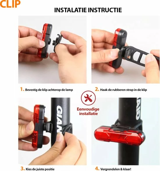 De achterlamp wordt geleverd met twee bevestigingssystemen. Hiermee kan je de lamp met de clip op je rugzak of fietstas bevestigen. Of zoals een normaal achterlicht aan je zadelpen. Hierdoor is de lamp te gebruiken voor stadsfietsen, elektrische fietsen, of voor op je racefiets of mountainbike! Natuurlijk kan je ook eenvoudig wisselen tussen de clip en de bevestiging op je fiets. Daarnaast is de CLIP 360 graden draaibaar, zodat je het achterlicht verticaal of horizontaal kan positioneren.