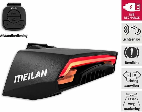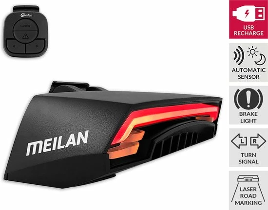Met dit revolutionaire achterlicht van Meilan wordt er met jou rekening gehouden op de weg. Het achterlicht is namelijk bestuurbaar met een afstandsbediening, die je op je stuur kan bevestigen. Het licht heeft onder andere een dag- of nachtdetectie, richtingaanwijzer en wegmarkeringen met lasers. Ook zit er een remlichtfunctie op het licht, waarmee jouw achterliggers kunnen zien als je remt. De richtingaanwijzer maakt jouw fietstocht een stuk veiliger voor jou, maar ook voor andere deelnemers aan het verkeer.