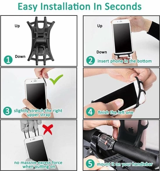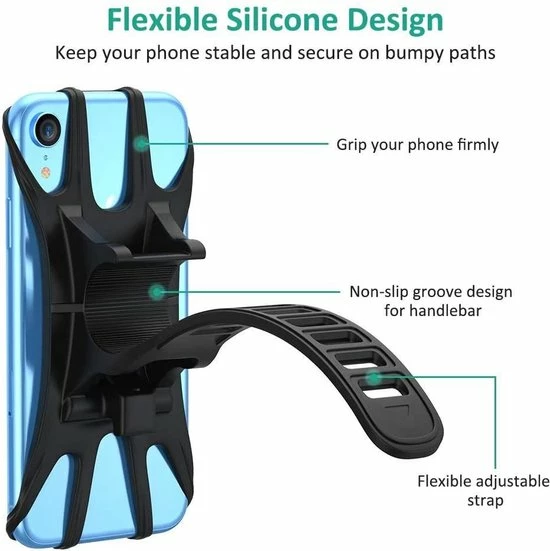 ✦ Stevig en veilig: gemaakt van hoogwaardig siliconen, flexibel siliconen absorbeert alle schokken in tegenstelling tot plastic bevestigingen die er zijn. Siliconen elastische banden binden je telefoon stevig aan de fiets, zelfs op een hobbelige weg