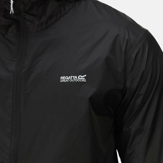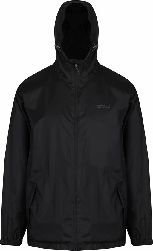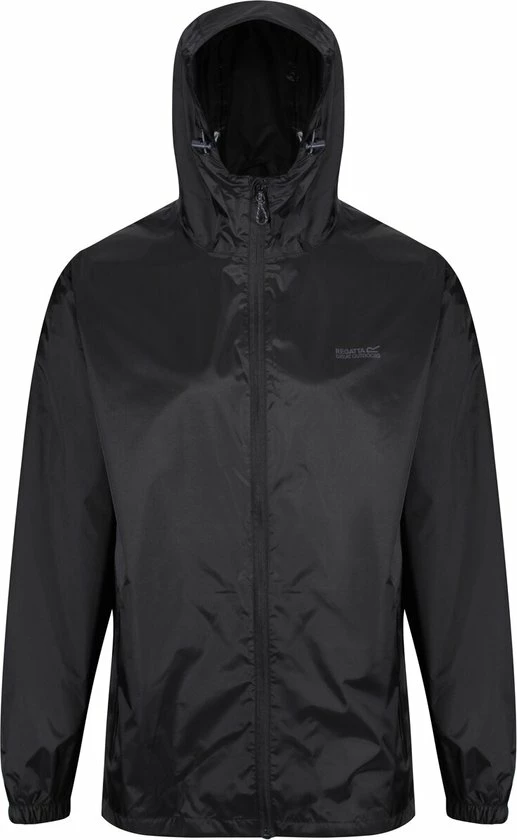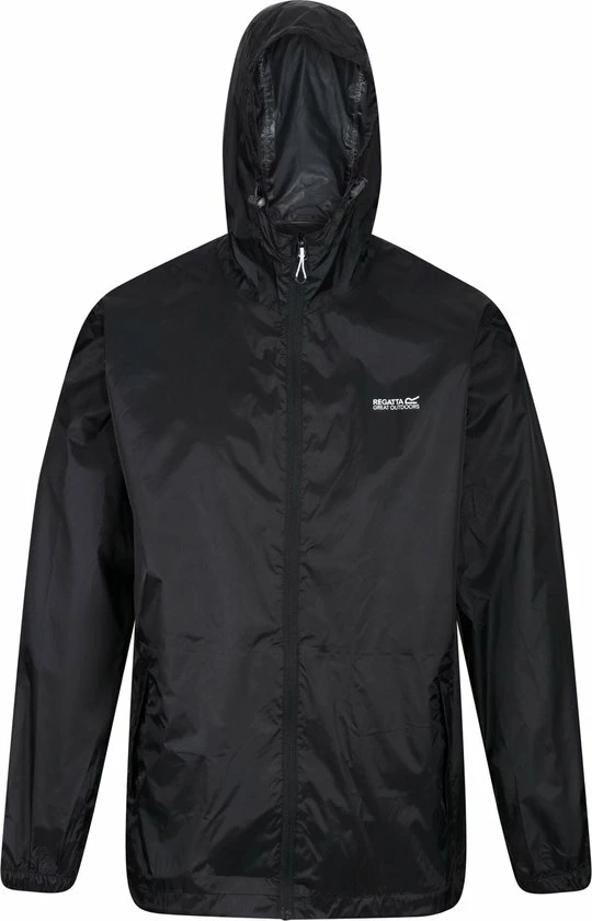 De Pack-It Jacket van Regatta voor heren is gemaakt van waterbestendige en ademende ISOLITE 5000-polyamide en heeft een verstelbare capuchon, een dunne drukknoopsluiting, twee handige zakken en een kleine draagzak. Met Regatta-opdruk op de borst.