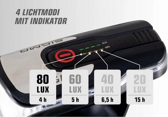 De aura 80 USB straalt met 80 lux goed 90 meter ver en is daarmee ook ver op verharde wegen een veilige begeleider. Dankzij nauwkeurige indicatoren aan de bovenkant informeert de koplamp precies over de resterende accuvermogen voet en de ingestelde lichtmodus. Het achterlicht NUGGET-II garandeert een grote veiligheidsfactor in het verkeer door de High Power LED en een zichtbaarheid vanaf de zijkant van meer dan 220?. Het StVZO achterlicht kan snel en zonder gereedschap op elke zadelpen bevestigen. Light Guide De zijdelingse Light Guide is niet alleen een optisch hoogtepunt. Met de twee extra LED’s zorgt hij voor een aanzienlijk hogere zichtbaarheid in het verkeer. Homogeen lichtbeeld De aura 80 USB is voorzien van een Osram LED. In combinatie met de hoogwaardige look produceert deze een zeer gelijkmatige lichtverdeling en zorgt voor een optimale verlichting over alle licht zones heen. Oplaadbaar De aura 80 USB heeft een ge?ntegreerde accu. Deze wordt via de micro-USB-bus bijgeladen wat ook op elke PC mogelijk is. Met de meegeleverde micro-USB-kabel is de koplamp in maximaal 4,5 uur weer volledig opgeladen. De lithium-ion-accu beschikt over een diep ontladings- en overladingsbeveiliging. Verder heeft hij geen memory-effect en kan probleemloos weer volledig opgeladen worden. Inschakelbeveiliging Met een dubbelklik wordt de AURA 80 USB ingeschakeld. met een lange toetsdruk gaat de lamp weer uit. Deze functie voorkomt onbedoeld inschakelen, bijvoorbeeld in de tas. Montage zonder gereedschap mogelijk De praktische siliconen stuurhouder is vast met de Aura 80 USB verbonden en garandeert een snelle en nauwkeurig passende bevestiging aan elke fietssturen. Zo kan het fietslicht zonder gereedschap worden gemonteerd en verwijderd. Bovendien is de AURA 80 USB ook met andere sigma-houdt systemen compatibel, zoals bijv. de screw bracket en de universele houder voor helm. De teksten voor dit artikel zijn automatisch vertaald.