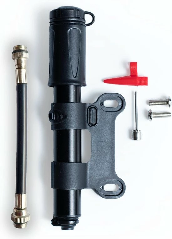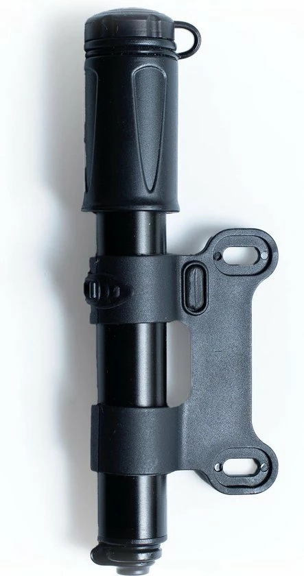 Compacte mini fietspomp welke gemonteerd kan worden achter de bidonhouder. De pomp heeft een flexibele slang welke aan het ventiel gekoppeld kan worden. Dit zorgt voor een goede afdichting en flexibiliteit in de pomphouding waardoor je meer kracht kunt zetten. De pomp is geschikt voor de meest gangbare ventieltypes. De mini fietspomp beschikt over een aluminium behuizing en een zwarte montage beugel. Door de meegeleverde extra ventielen kan de pomp ook gebruikt worden als ballenpomp.
